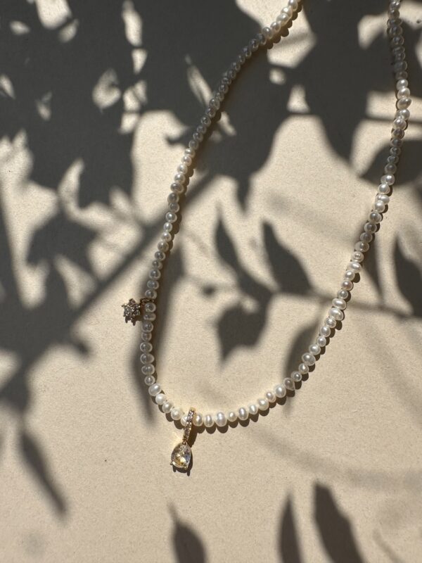 שרשרת פנינים אורך 45 סמ עם אלמנט טיפה ופרח משובצים