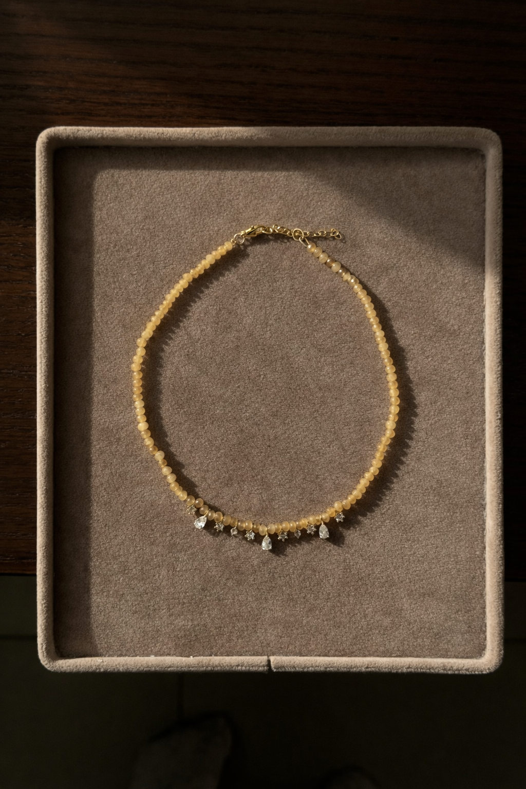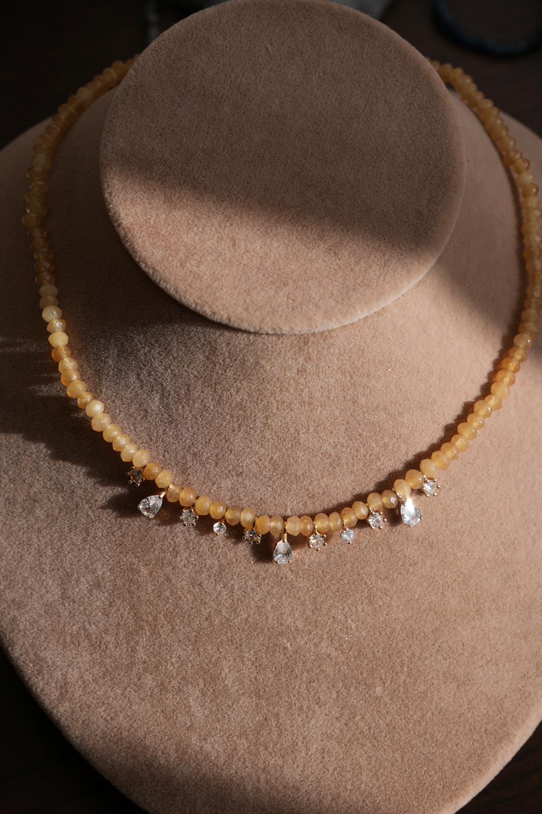 עשוי מאבני גייד בגוון דבש עם טיפות אליאנה מציפוי זהב 14K