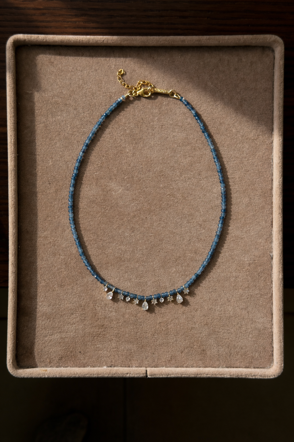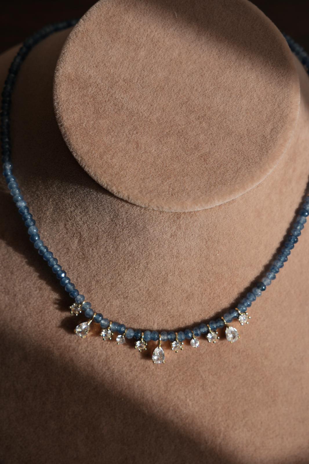 עשוי מאבני גייד בגוון כחול בהיר עם טיפות אליאנה מציפוי זהב 14K
