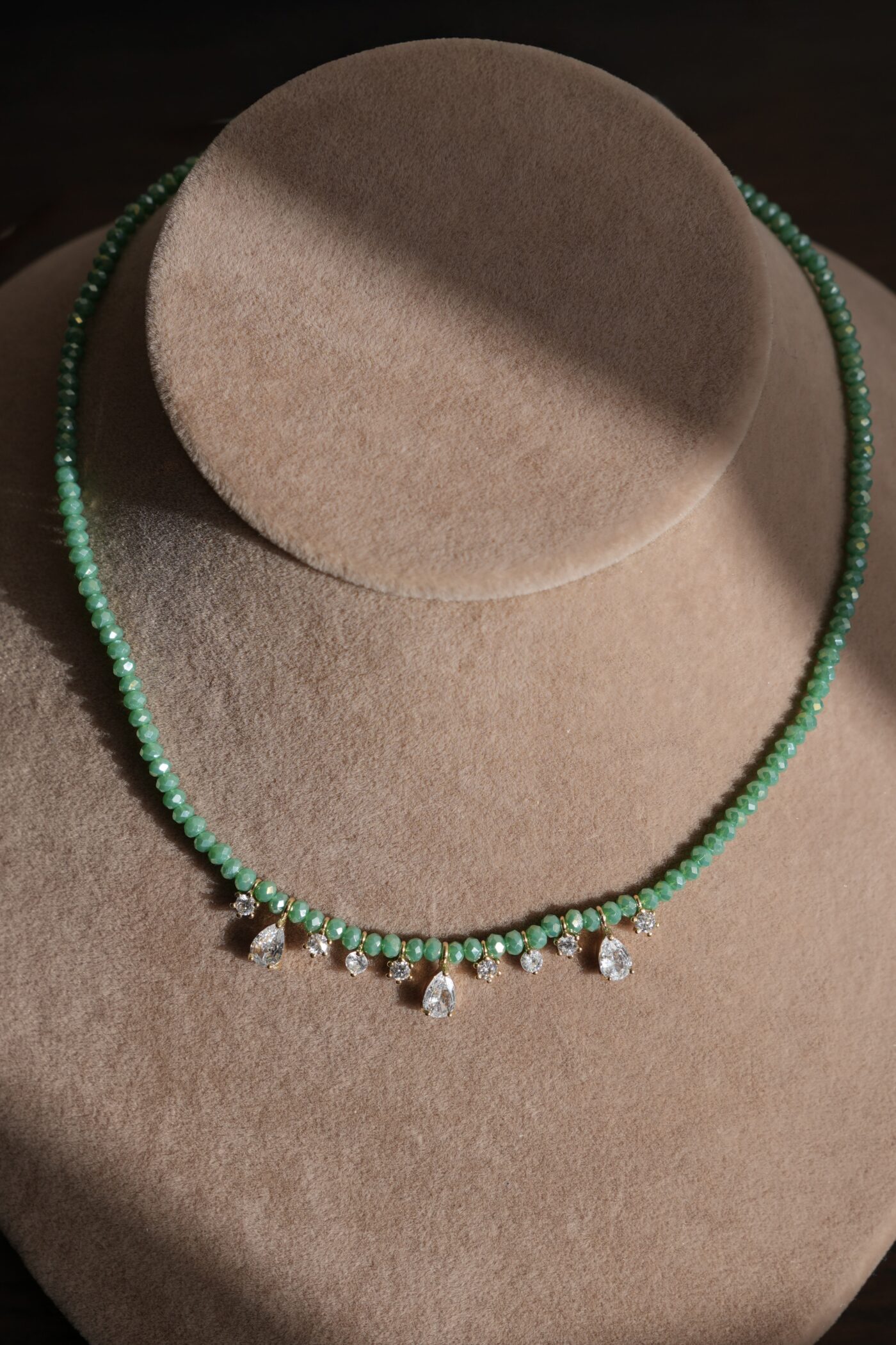 עשוי מאבני גייד בגוון ירוק בהיר עם טיפות אליאנה מציפוי זהב 14K
