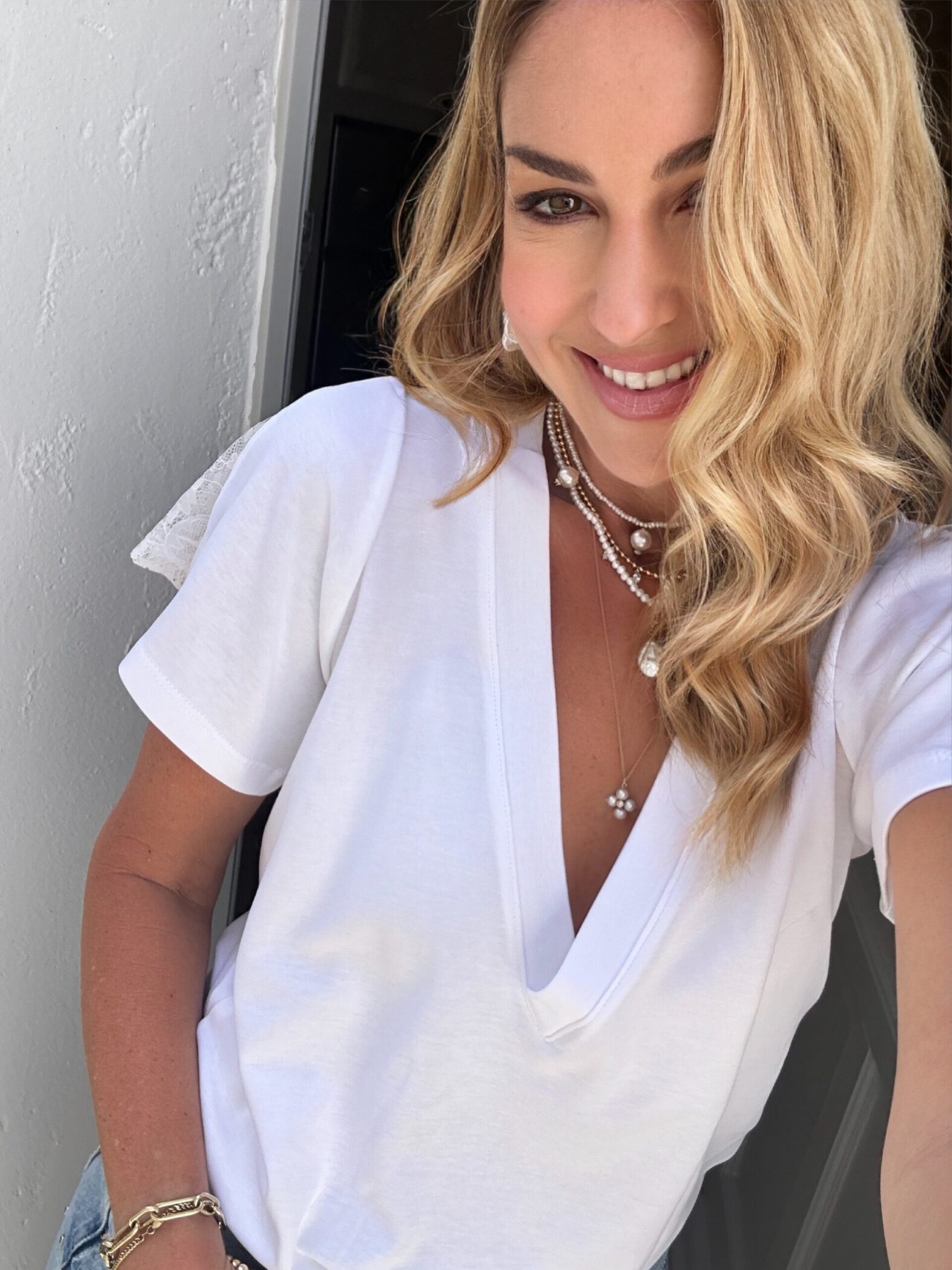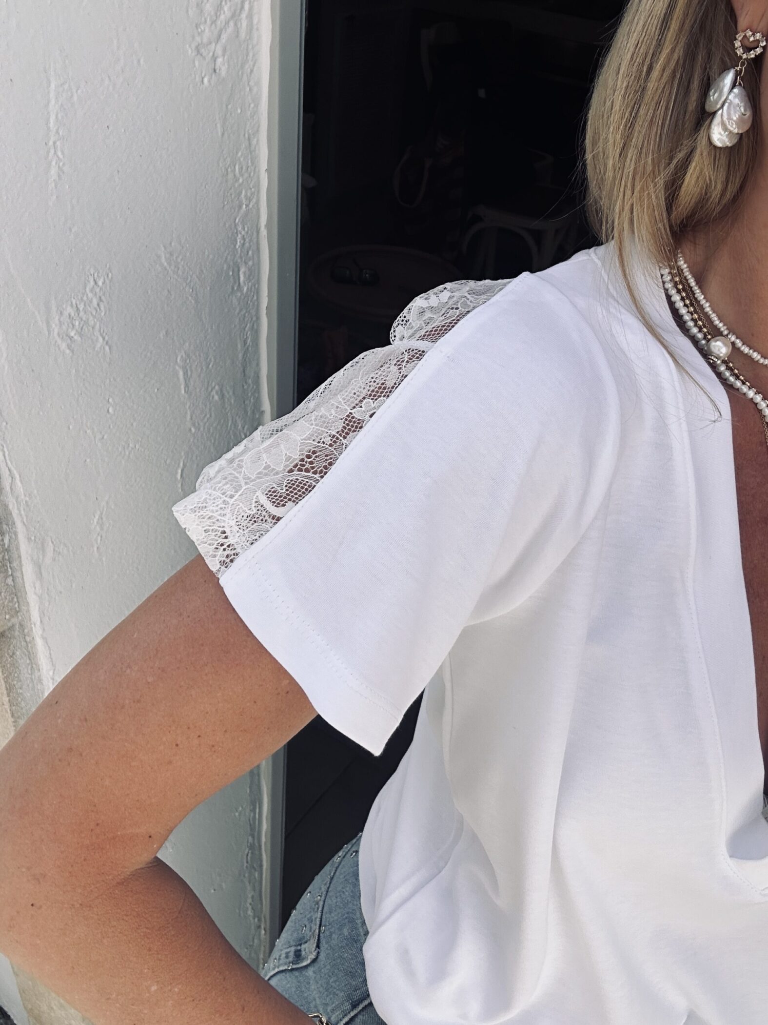 טישרט וי לבנה עם וולן תחרה בשרוול
