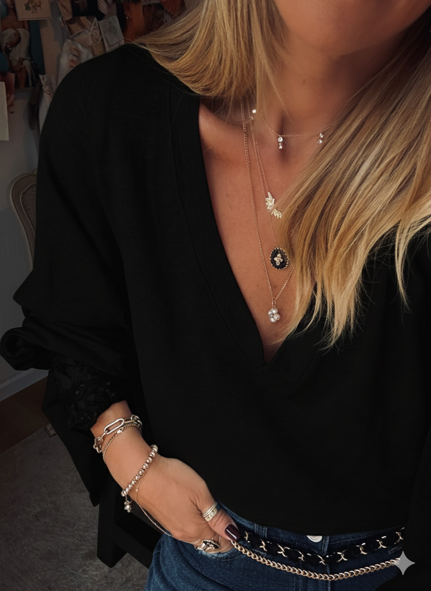 חולצת וי מבד פשתן עם קרושה בשרוול