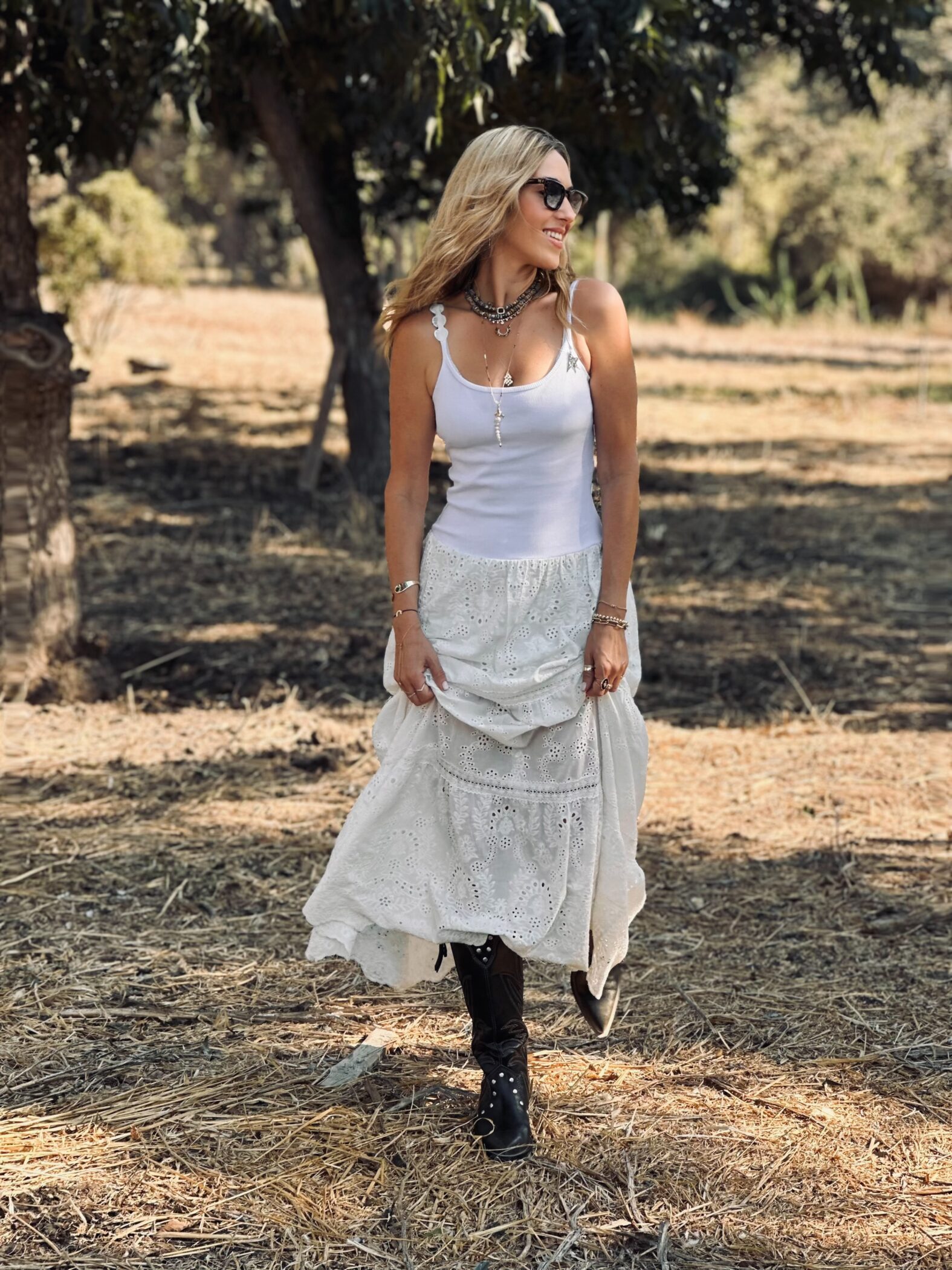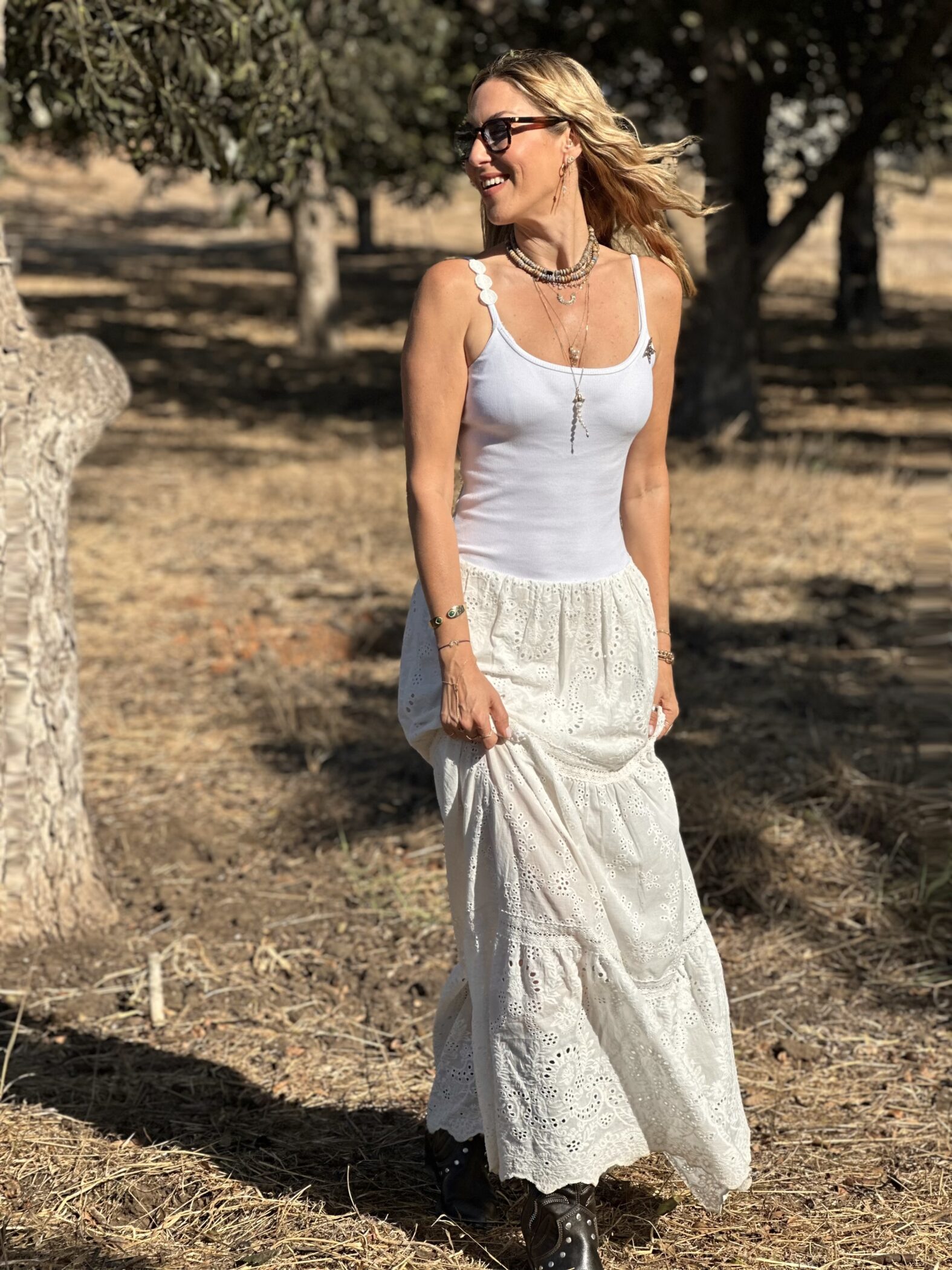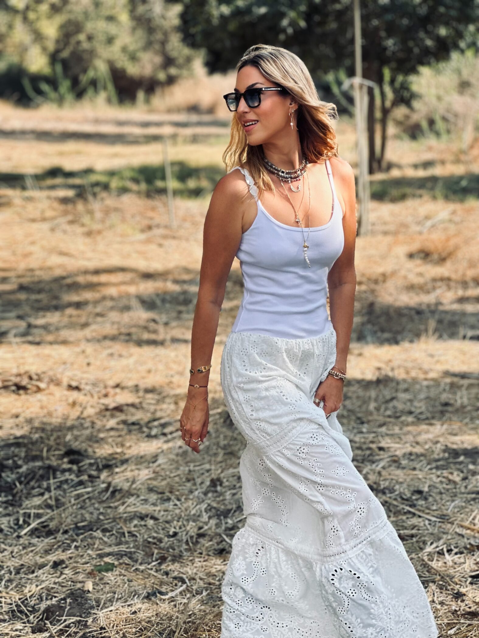 שמלה מושלמת בשילוב של בד ריב גמיש בחלק העליון מחובר לחצאית מבד כותנה רקומה.