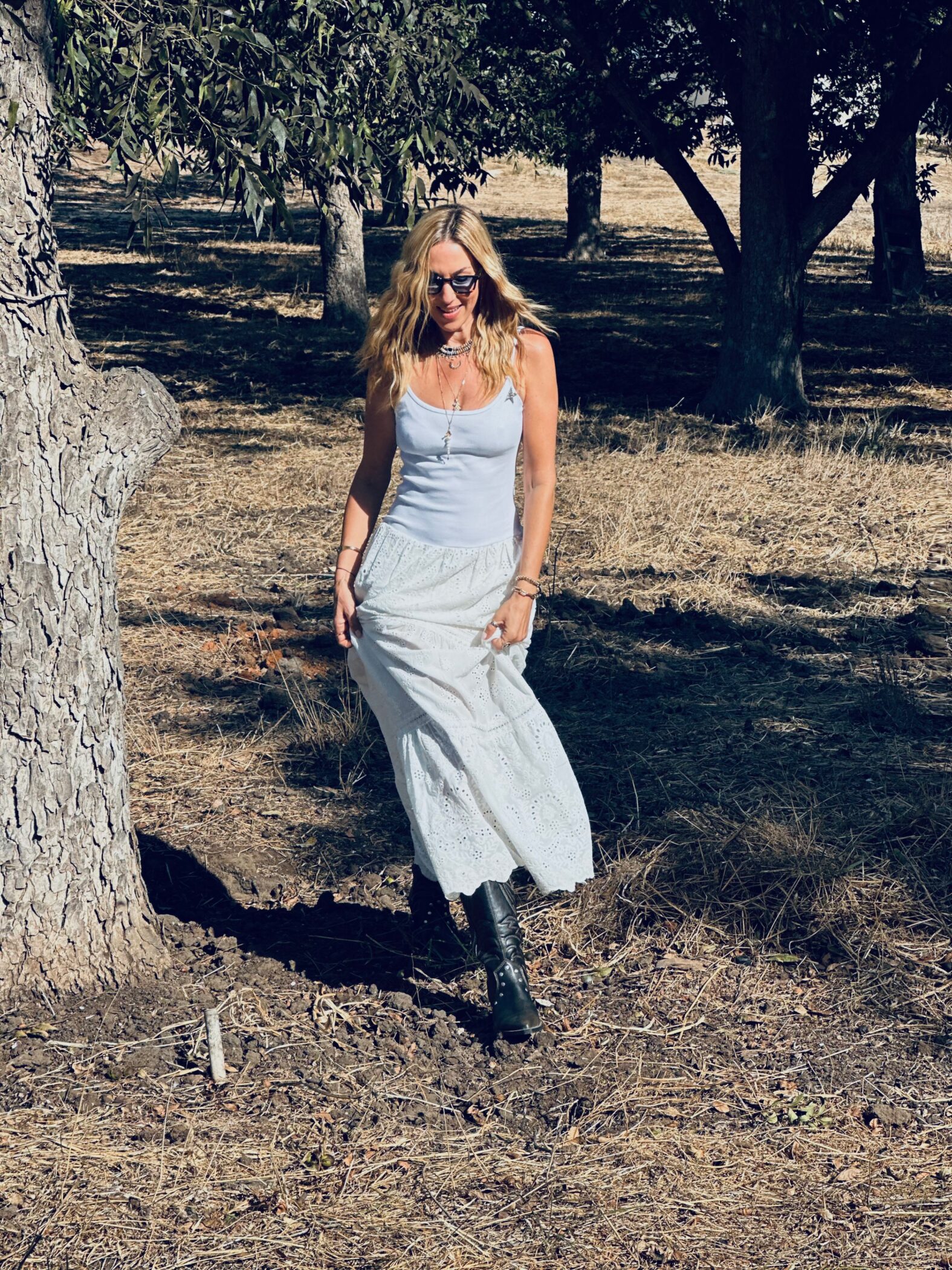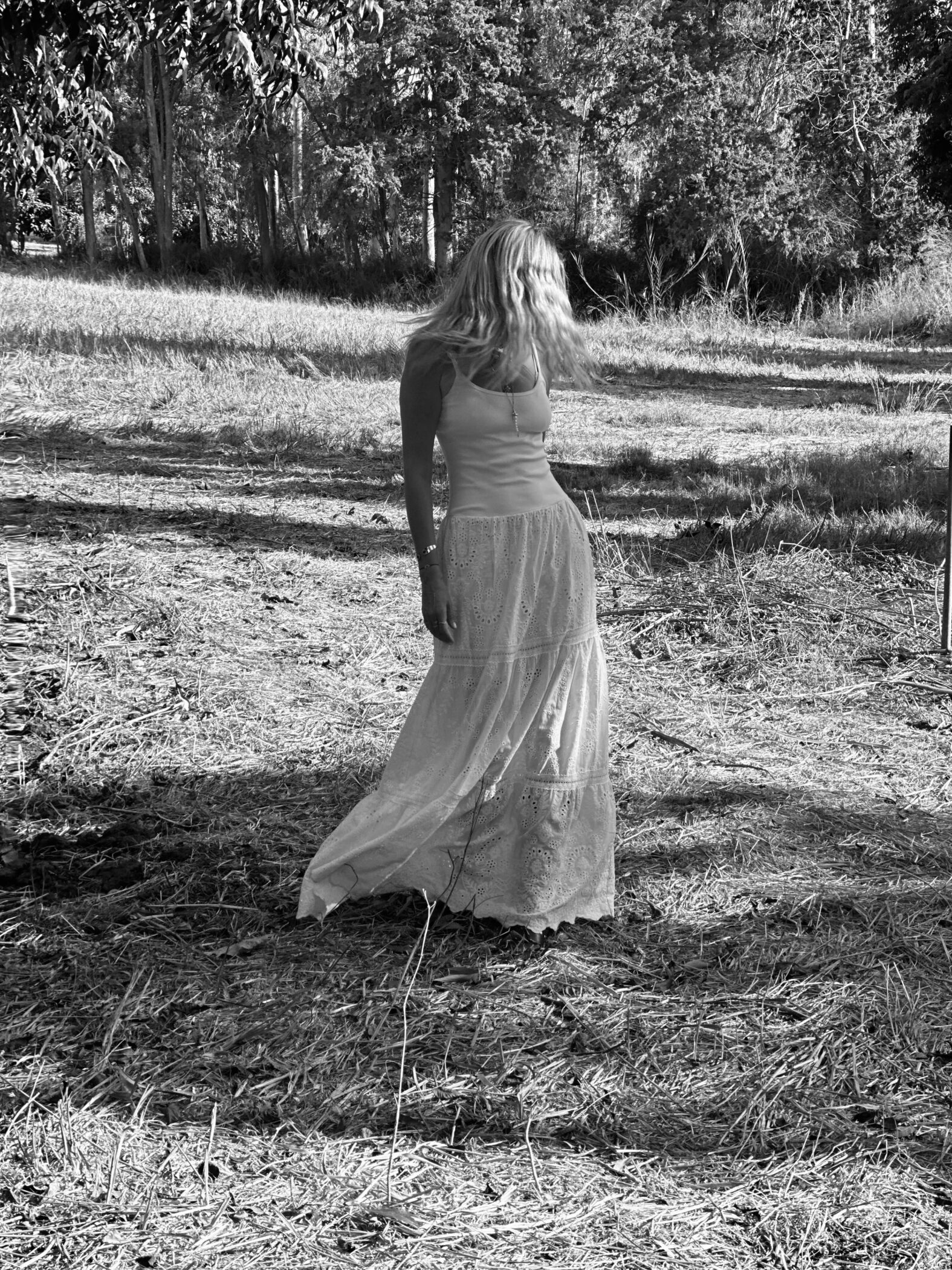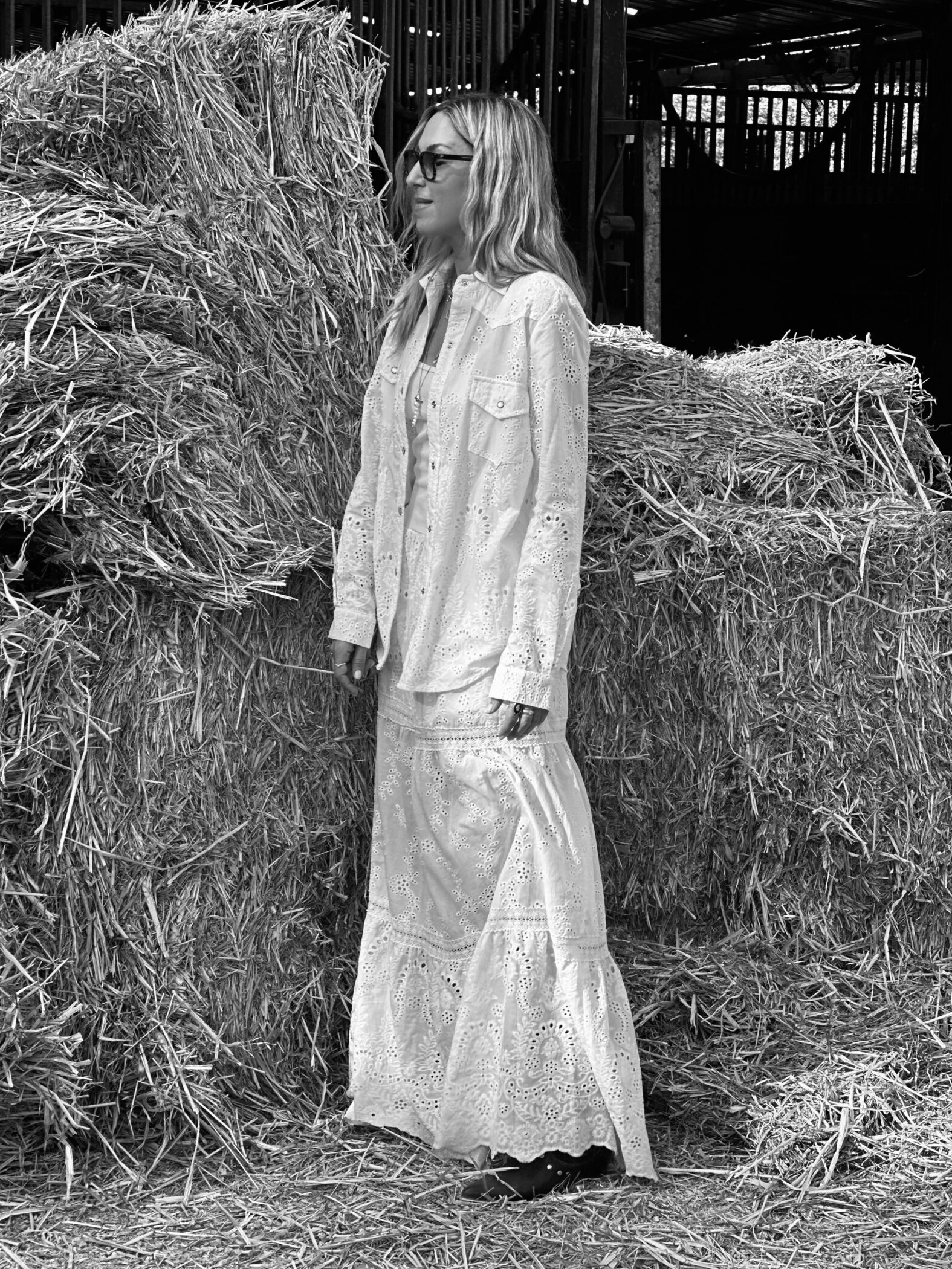 שמלה מושלמת בשילוב של בד ריב גמיש בחלק העליון מחובר לחצאית מבד כותנה רקומה.